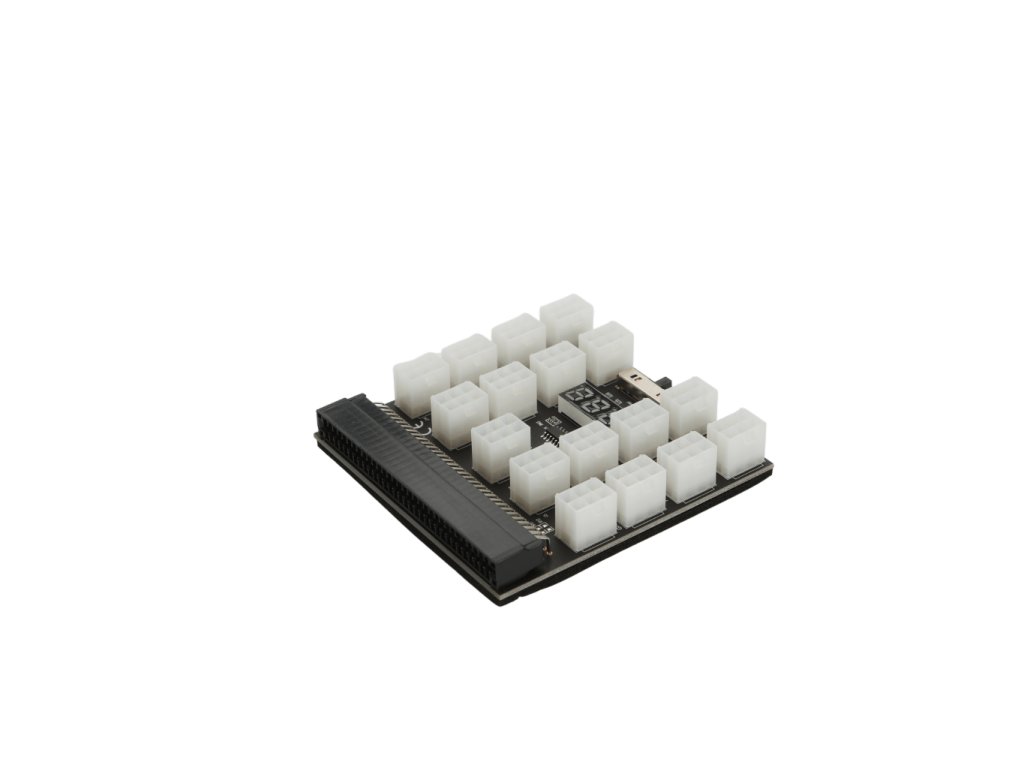 Scheda breakout a 17 slot per alimentatori server HPE con connettore common-slot. La scheda breakout ha un totale di 17 slot a 6 pin per cavi PCIe, un display che mostra la tensione fornita dall'alimentatore e un pulsante ON/OFF.