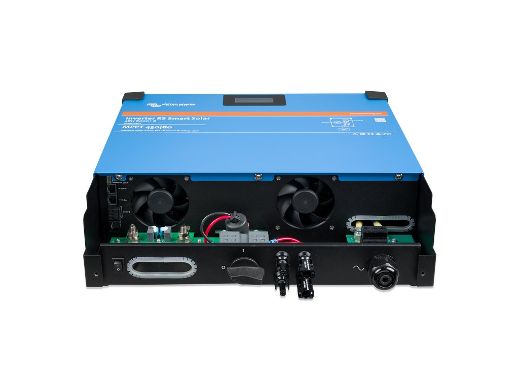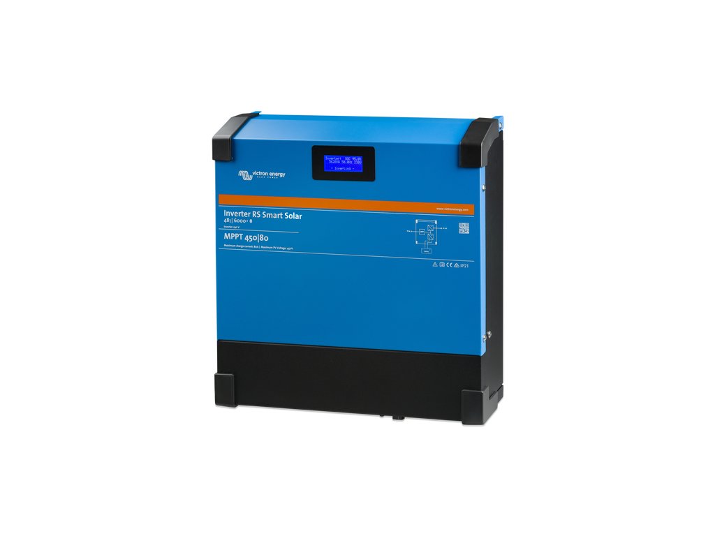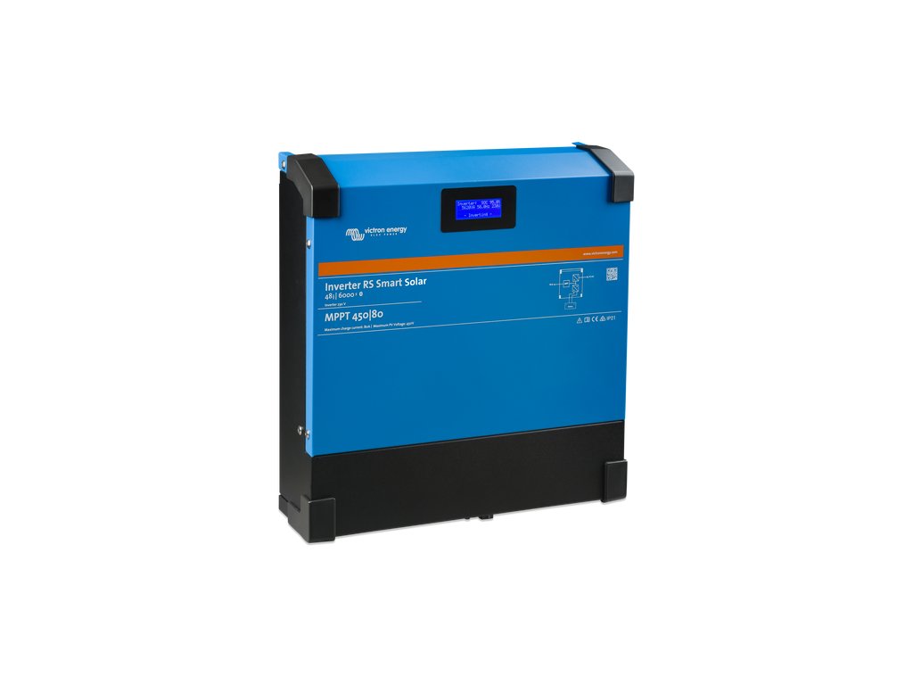 The RS Smart Solar 48/6000 inverter is a 48V 6kVA inverter with a 450V DC 4kWp PV input. It is used in off-grid solar applications where AC power is required. - Combination of inverter, bidirectional DC-DC converter and MPPT