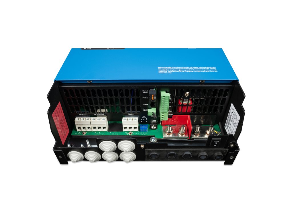 During a power outage or when the shore power or generator power is disconnected, the inverter integrated in the Multi quickly steps in and seamlessly takes over power to the connected loads. This transition is so fast, in less than 20 milliseconds, that computers and other electronic devices remain operational without any interruption.